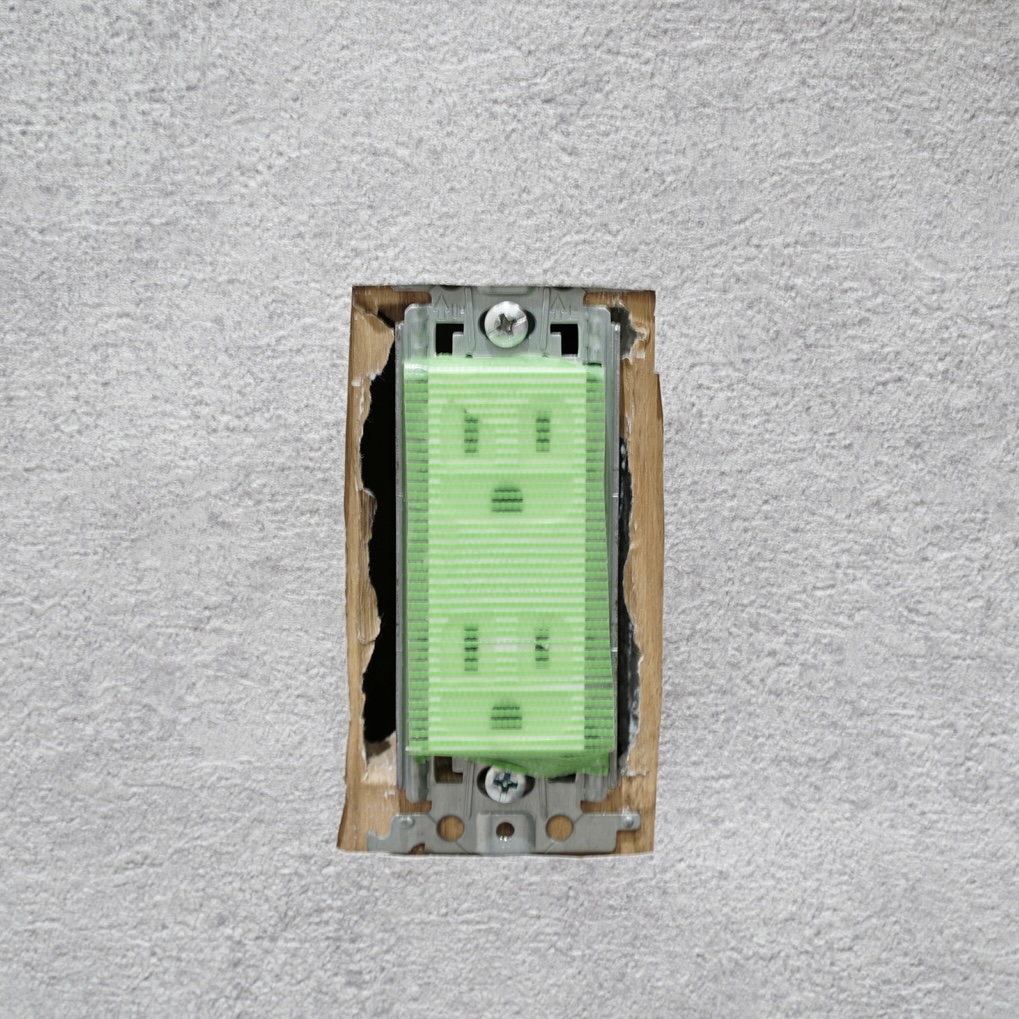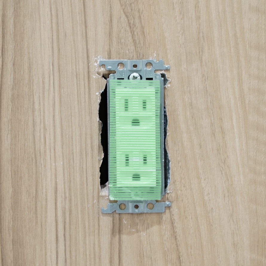 受け側のプレートを外したらむき出しになったコンセント(スイッチ)部分に養生テープを貼り、壁紙ののりがつかないようにしておきます。