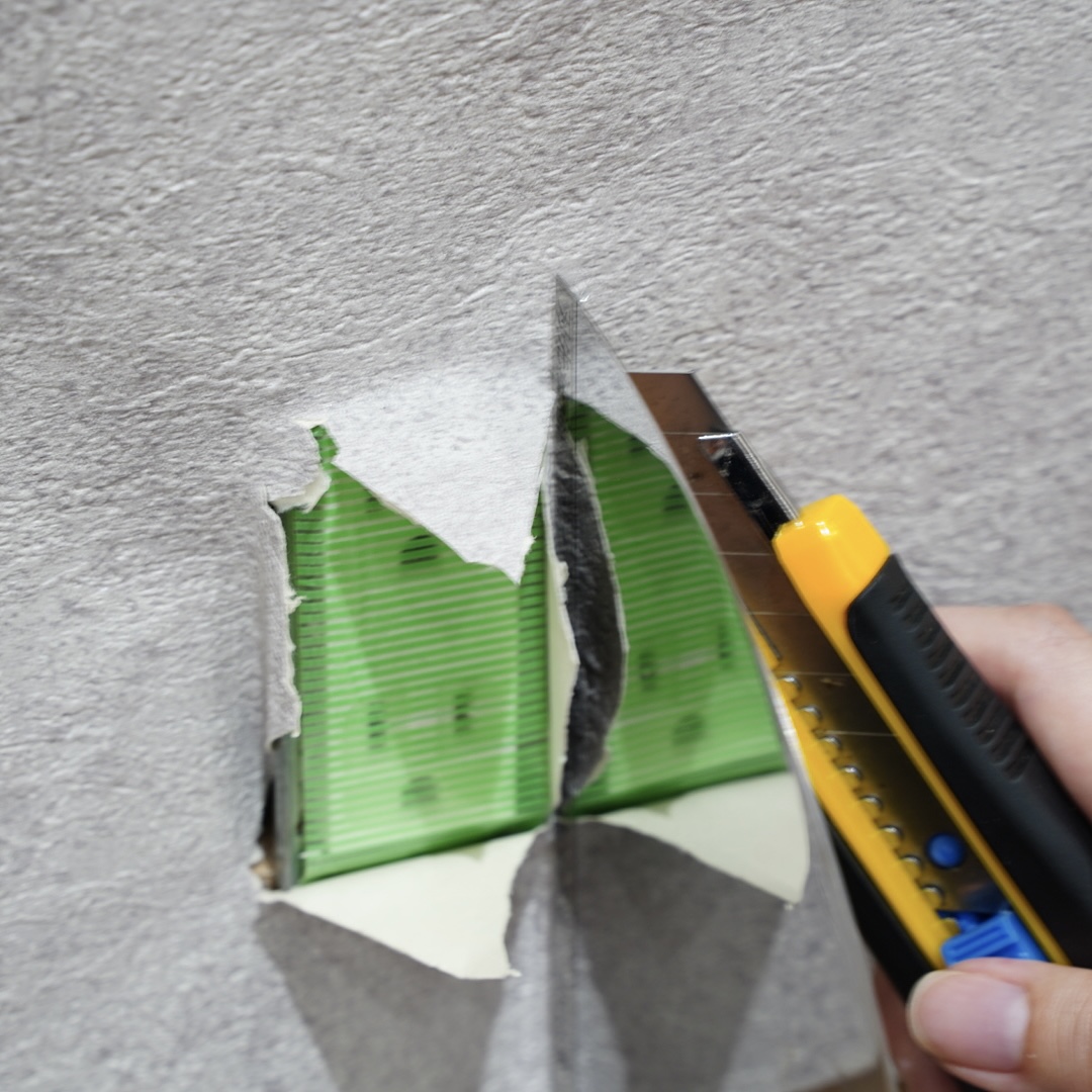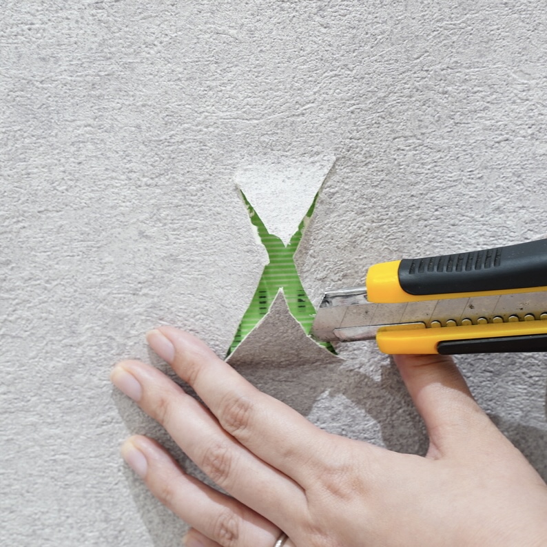 手でコンセント(スイッチ)の位置を確認し、その角から内側に向かってバツ印を書くようにカッターで切り込みを入れます。このときコンセント(スイッチ)を傷つけないよう気を付けてください。