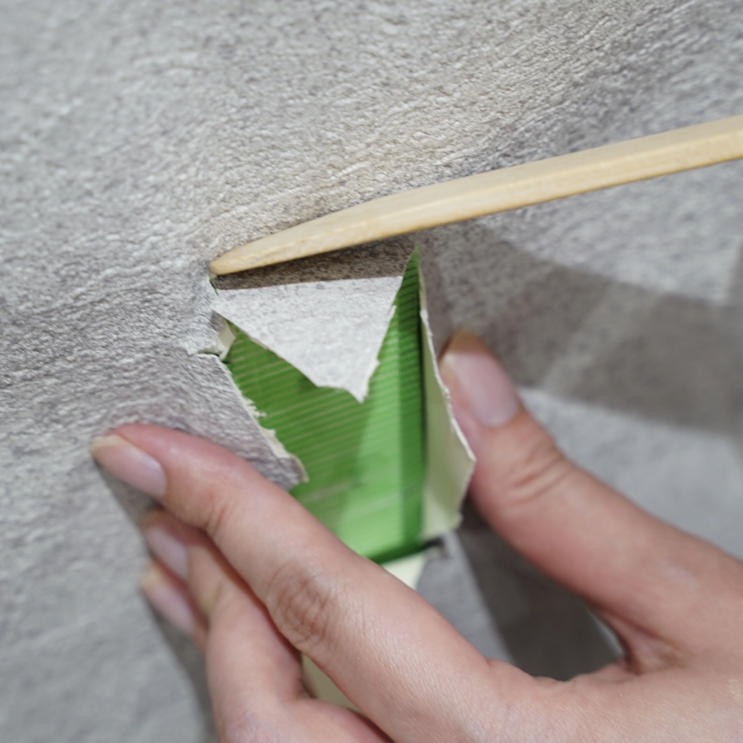 まず、古い壁紙のきわにカッターで切り込みをいれて、継ぎ目部分からゆっくりと剥がしていきましょう。