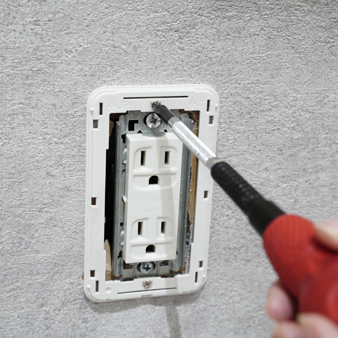 コンセントやスイッチの位置は事前に確認し、プレートを外します。表側のプレートを外すと受け側のプレートが出てくるので、プラスドライバーを使ってネジを回し、取り外してください。なお安全のため、プレートを外す前にブレーカーを落としておきましょう。